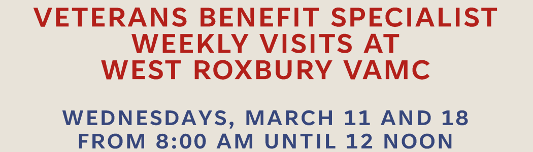 Veterans Benefit Specialist weekly visits at West Roxbury VAMC flyer, 8:00 a.m. - 12:00 p.m. Wednesdays, March 11 and 18, 2026. West Roxbury VA Campus, 1400 VFW Parkway, West Roxbury, MA 02132, 2nd Floor, Building 3, Room 2D-102B. A Veteran Benefits Administration (VBA) specialist can help people understand the benefits available and how to apply for them. These specialists are knowledgeable about Service-Connected Compensation claims, Non-Service Connected (NSC) Pension, and Survivors’ Benefits.