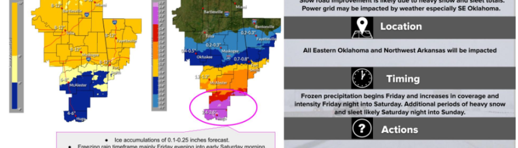 - From the City of Checotah – “The City of Checotah will provide a warming shelter that will be located at the Checotah Community Center. The shelter will be open this Friday, January 23rd at noon and stay open until Monday, January 26th until noon. No cots will be provided. If you have any questions, please call City Hall at