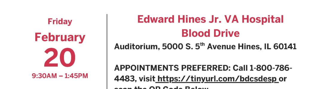 Our next blood drive is on February 20 in the Building 9 Auditorium from 9:30 a.m. to 1:45 p.m.