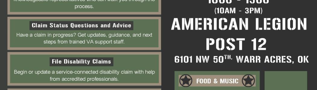 Resources will be available for Veterans to Apply for VA Benefits, ask questions about Claims, File disability claims and more.