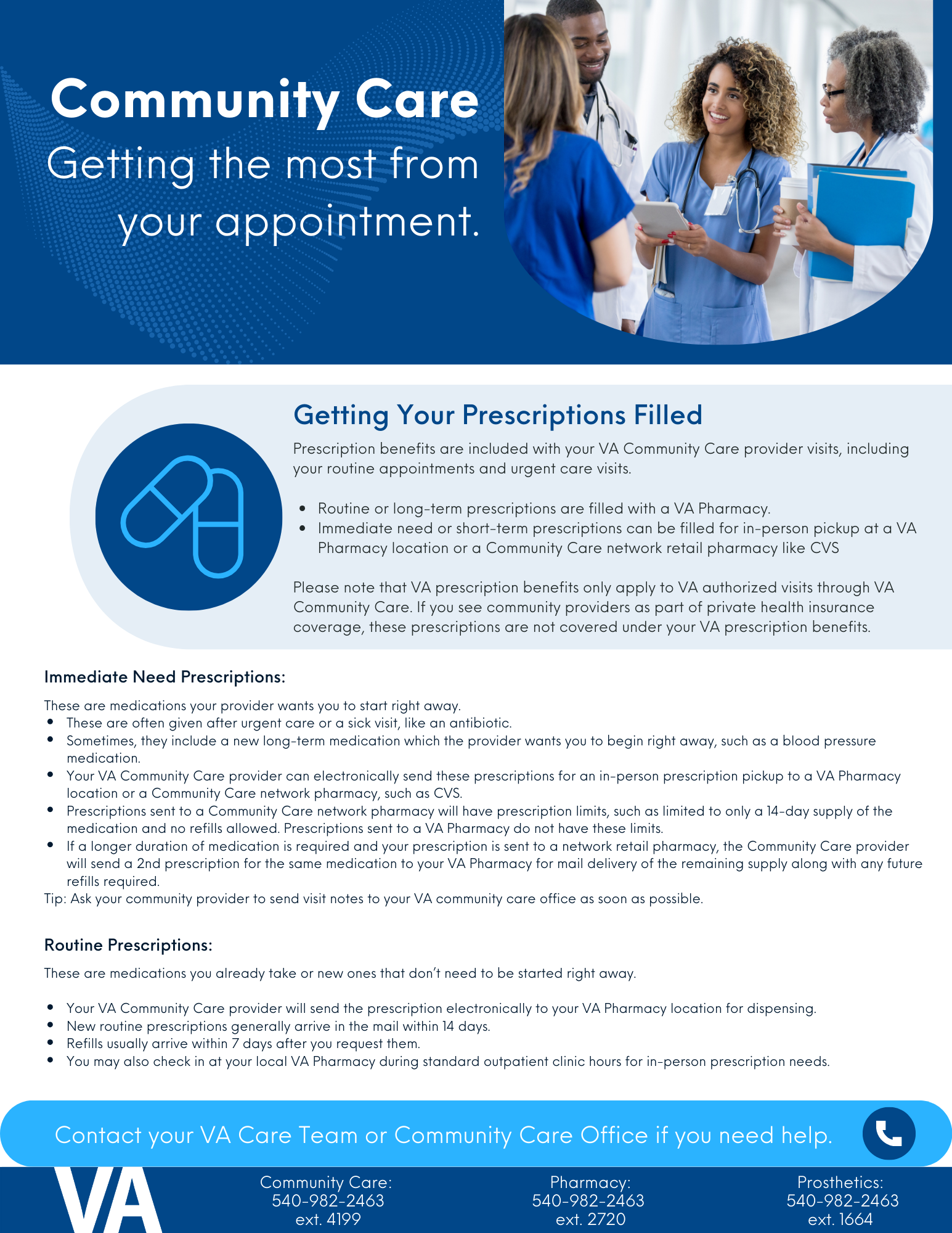 This page provides easy-to-understand guidance for Veterans and their families on care in the community information -- including transportation support, billing, emergency care reporting, adaptive equipment, and prescription services.