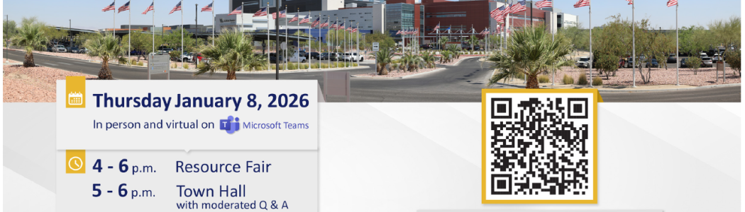 VA Southern Nevada Healthcare System, in partnership with the Veterans Benefits Administration's Reno Regional Office and Nevada Department of Veterans Services, will host a quarterly Veterans Town Hall and Resource Fair at the North Las Vegas VA Medical Center from 4-6 p.m. and a moderated Town Hall from 5-6 p.m., Thursday, Jan. 8, 2026.
